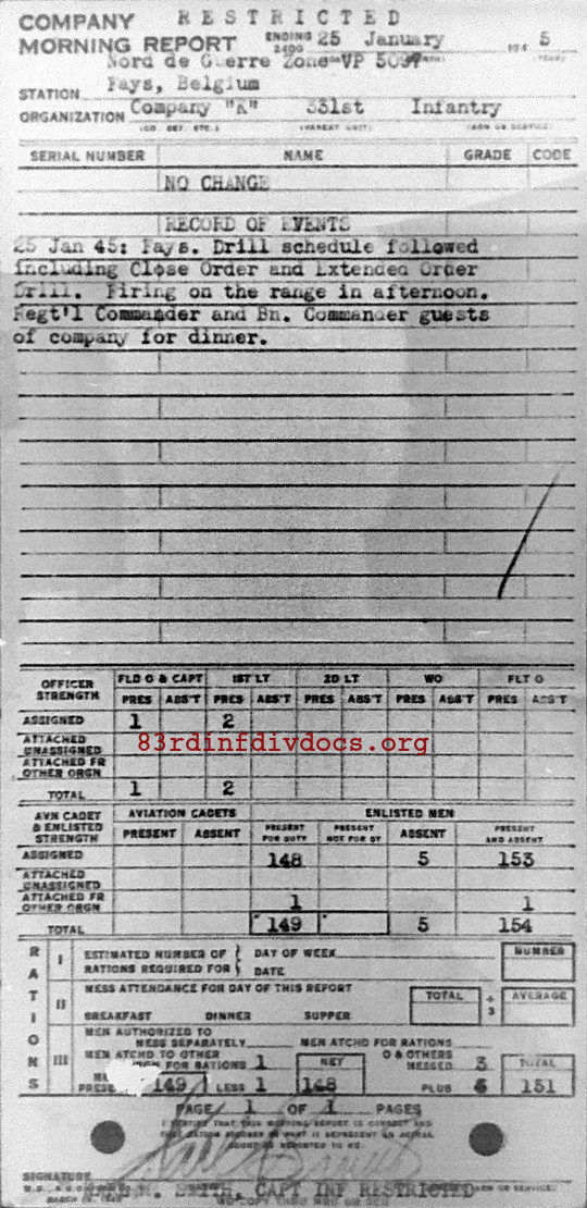 25 Jan 45: Fays. Drill schedule followed including Close Order and Extended Order Drill. Firing on the range in the afternoon. Regt'l Command and Bn. Commander guests of company for dinner.