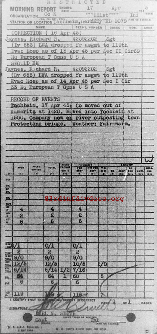 Tochheim, 17 Apr 45: Co moved out of Kameritz at 1420. Moved into Toccheim at 1500. Company now on river outposting town. Protecting bridge. Weather: Fair-warm.