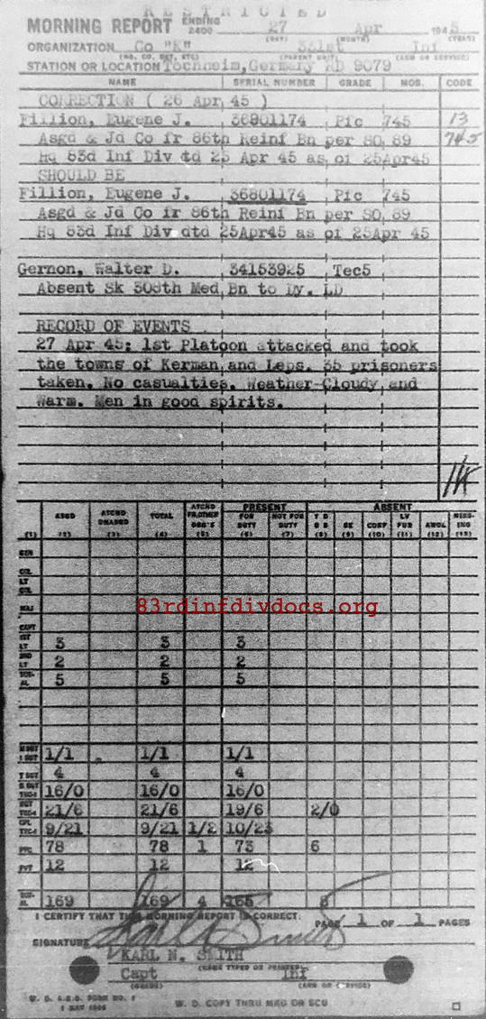 27 Apr 45: 1st Platoon attacked and took the towns of Kerman and Leps. 35 prisoners taken. No casualties. Weather - Cloudy and Warm. Men in good spirits.