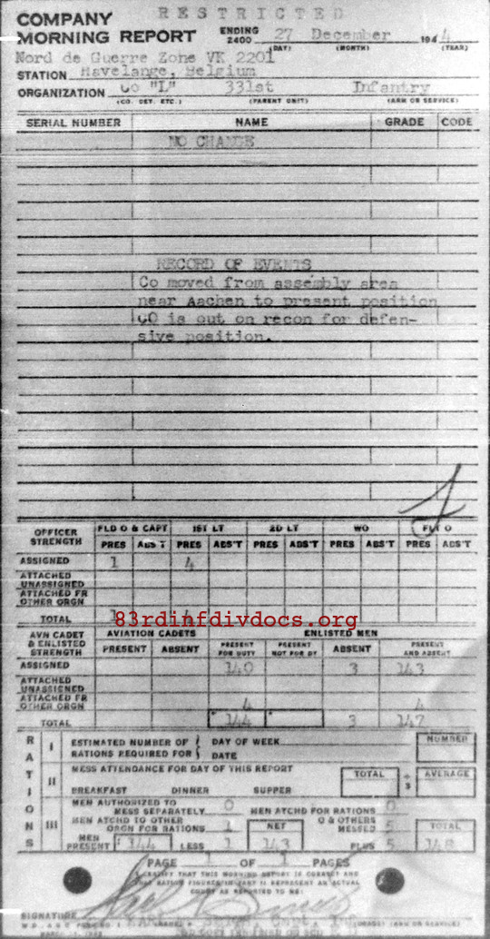 Co moved from assembly area near Aachen to present position. Co is out on recon for defensive position.