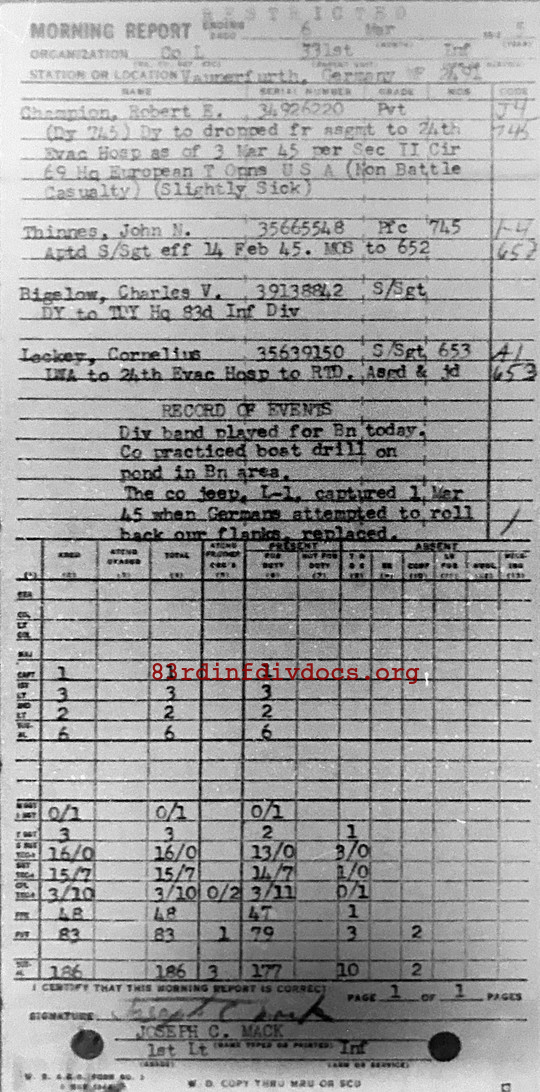 Div band played for Bn today. Co practiced boat drill on pond in Bn area. The co jeep, L-1 captured 1 Mar 45 when Germans attempted to roll back our flanks, replaced.