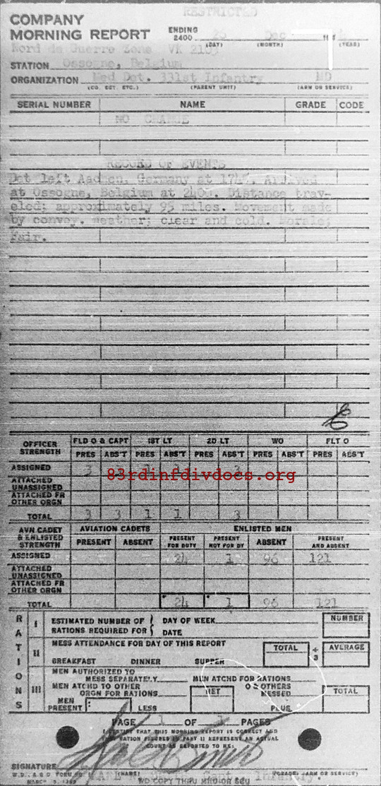 Det left Aachen, Germany at 1745. Arrived at Ossogne, Belgium at 2400. Distance traveled; approximately 95 miles. Movement made by convoy. Weather; clear and cold. Morale: Fair