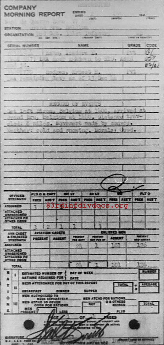 Det left Biron, Belgium at 1400, arrived at Grand Bru, Belgium 1440. Distance traveled: 8 miles. Movement made by convoy. Weather: cold and snowing. Morale: Good.