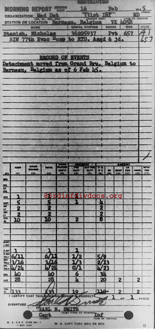 Detachment moved from Grand Bru, Belgium to Berneau, Belgium as of 6 Feb 45.