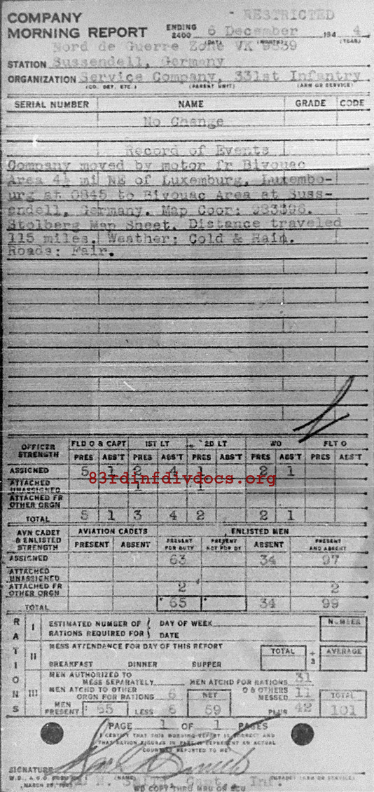 Company moved by motor fr Bivouac Area 4 1/2 mi NE of Luxembourg, Luxembourg at 0845 to Bivouac Area at Sussendell, Germany. Distance traveled 115 miles. Weather: Cold and Rain. Roads: Fair