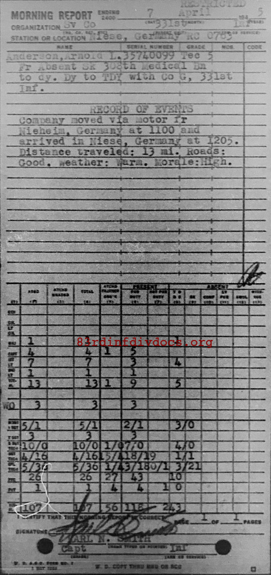Company moved via motor fr Nieheim, Germany at 1100 and arrived in Niese, Germany aty 1205. Distance traveled: 13 mi. Roads: Good. Weather: Warm. Morale: High.