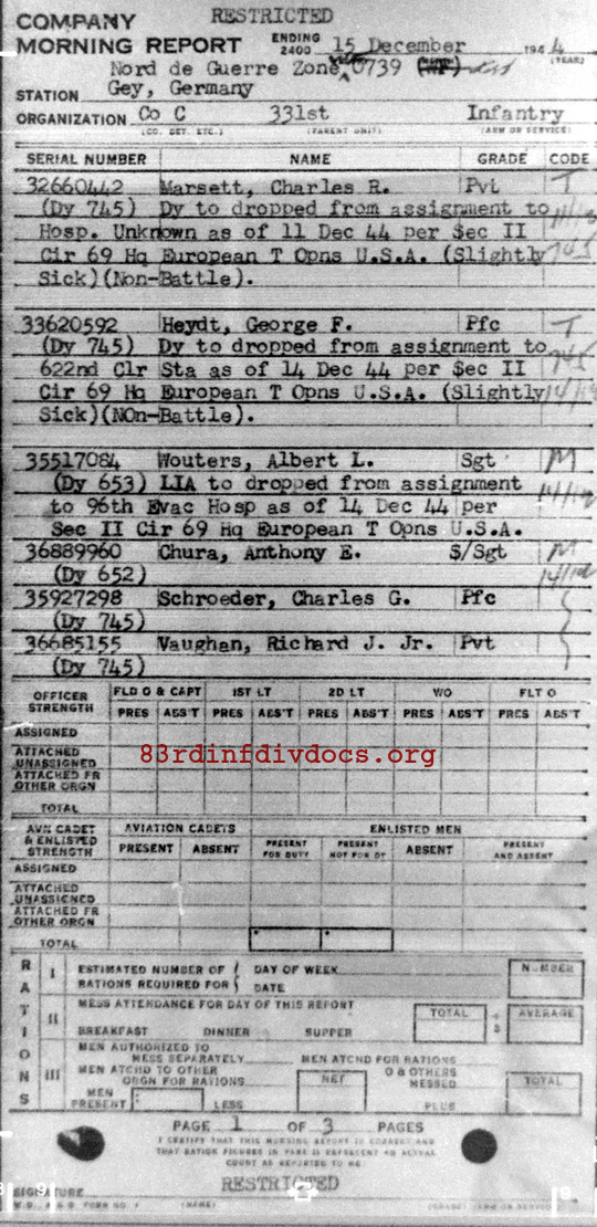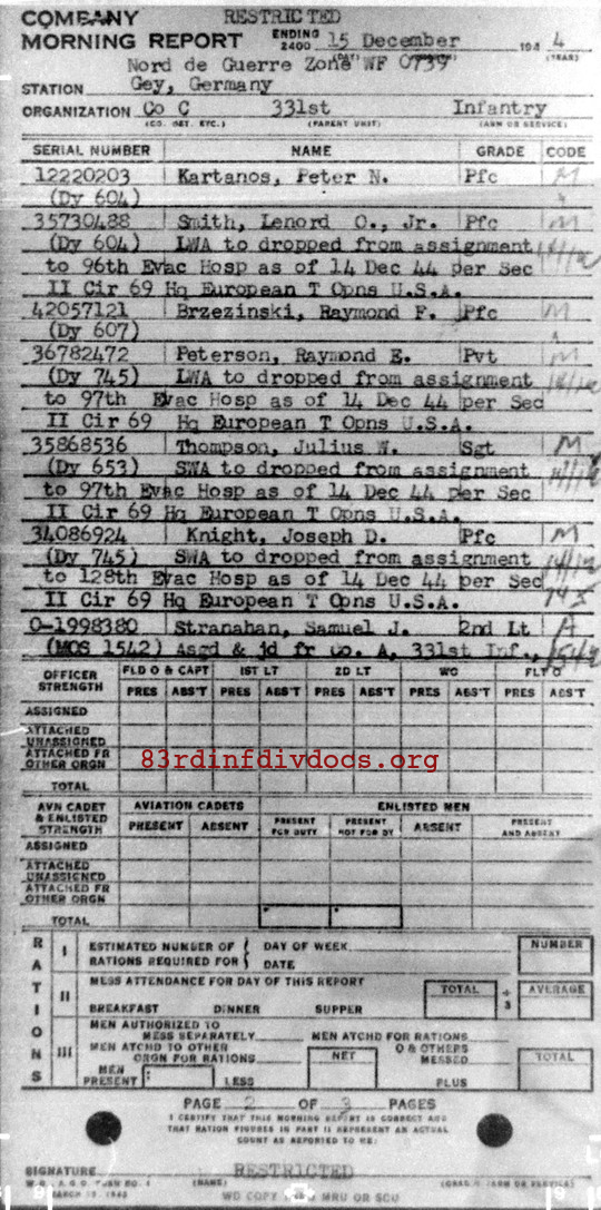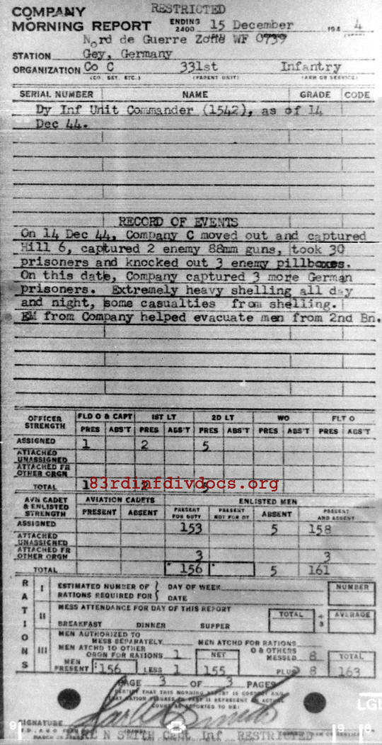 On 14 Dec 44, Company C moved out and captured Hill 6, captured 2 enemy 88mm guns, took 30 prisoners and knocked out 3 enemy pillboxes. On this date, Company captured 3 more German prisoners. Extremely heavy shelling all day and night, some casualties from shelling. EM from Company helped evacuate men from 2nd Bn