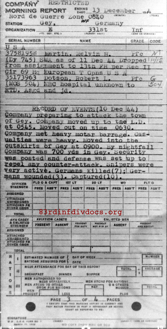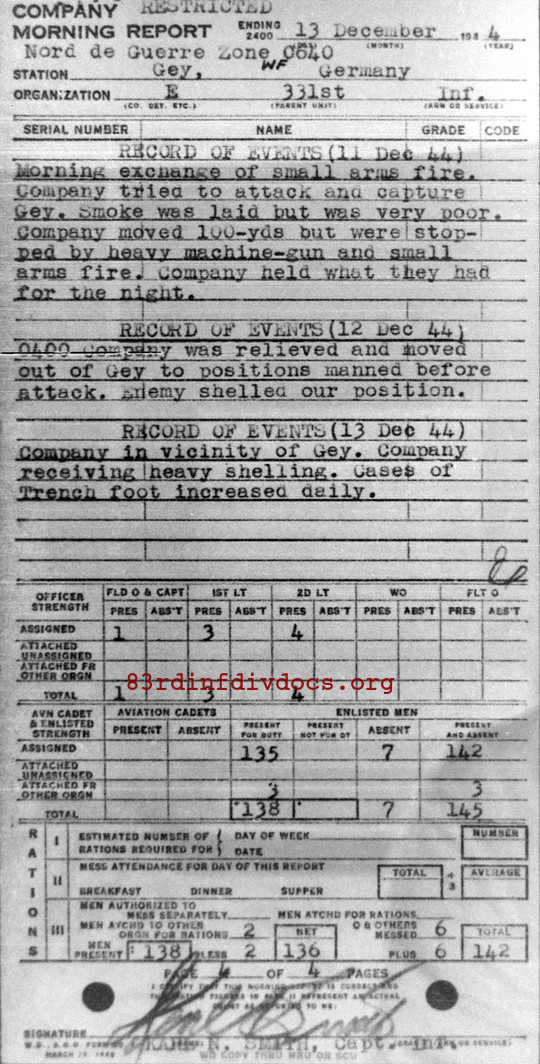 (10 Dec 1944) Company preparing for attack the town of Gey. Company moved up to the LD at 0545. Moved out on time 0630. Company met heavy mortar barrage. Casualties were heavy. Moved into the outskirts of Gey at 0900. Security was posted and defense was setup to repel and counter-attack. Snipers were very active. Germans killed (7), Germans wounded (3), Germans captured (10). (11 Dec 44) Morning exchange of small arms fire. Company tried to attack and capture Gey. Smoke was laid but was very poor. Company moved 100 yards but were stopped by heavy machine-gun and small arms fire. Company held what they had for the night. (12 Dec 44) 0400 Company was relieved and moved out of Gey to positions manned before attack. Enemy shelled our position. (13 Dec 44) Company in vicinity of Gey. Company receiving heavy shelling. Cases of trench foot increased daily.