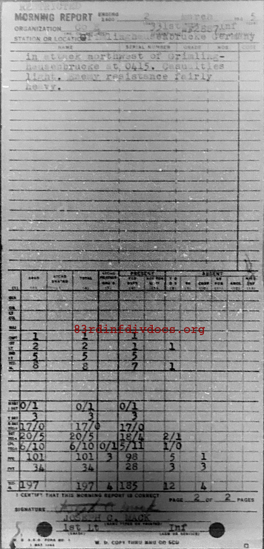 1 Mar 45 Company moved from Loveling to the town of Reuschenburg at 1445. Established CP in Reuschenburg at 1530. Company outposting town. 2 Mar 45 Company moved out in attack at 2245. Arrived at Grimlinghausenbrucke at 0355. Company moved out in attack northwest of Grimlinghausenbrucke at 0415. Casualties light. Enemy resistance fairly heavy.