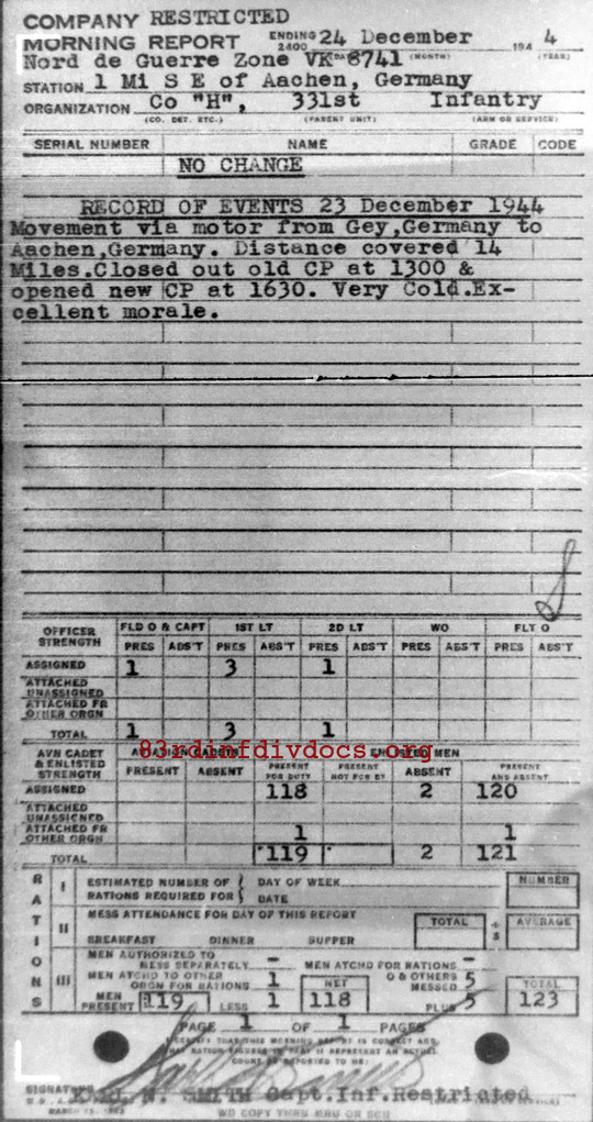 23 December 1944. Movement via motor from Gey, Germany to Aachen, Germany. Distance covered 14 miles. Closed out old CP at 1300 and opened new CP at 1630. Very cold. Excellent morale.