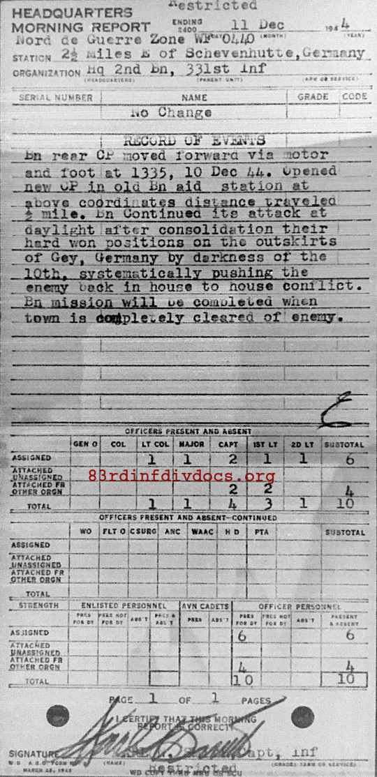 Battalion rear CP moved forward via motor and foot at 1335, 10 Dec 44. Opened new CP in old Bn aid station at above coordinates, distance traveled 1/2 mile. Bn continued its attack at daylight after consolidation their hard won positions on the outskirts of Gey, Germany by darkness of the 10th, systematically pushing the enemy back in house to house conflict. Battalion mission will be completed when town is completely cleared of enemy.