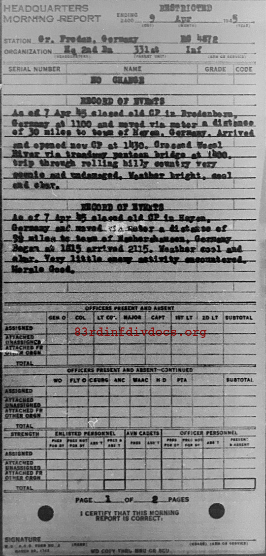 As of 7 Apr 45 closed old CP in Bredenborn, Germany at 1100 and moved via motor a distance of 30 miles to town of Heyen, Germany. Arrived and opened new CP at 1430. Crossed Wesel River via treadway pontoon bridge at 1400. trip through rolling hilly country very xxxnie and undamaged. Weather bright, cool and clear.