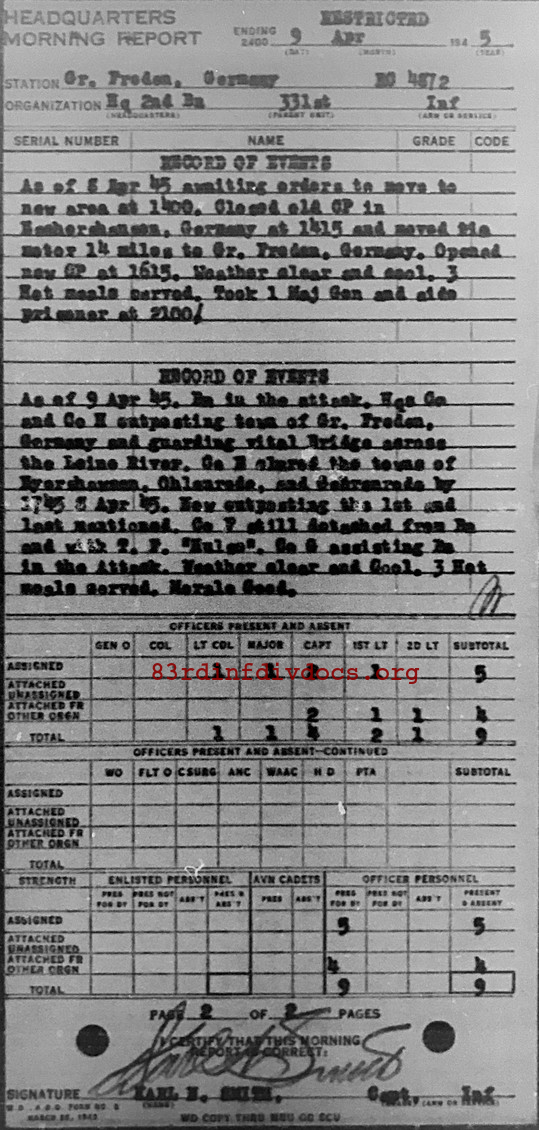 As of 9 Apr 45. Bn in the attack. Hqs Co and Co H outposting town of Gr. Freden, Germany and guarding vital Bridge across th Leine River. Co H cleared the towns of Eyershausen, Ohlenrede, and Gedrenrade by 1745 8 Apr 45. Now outposting the 1st and last mentioned. Co F still detached from Bn and with T.F. "Hulge". Co G assisting Bn in the attack. Weather clear and cool. 3 hot meals served. Morale Good.