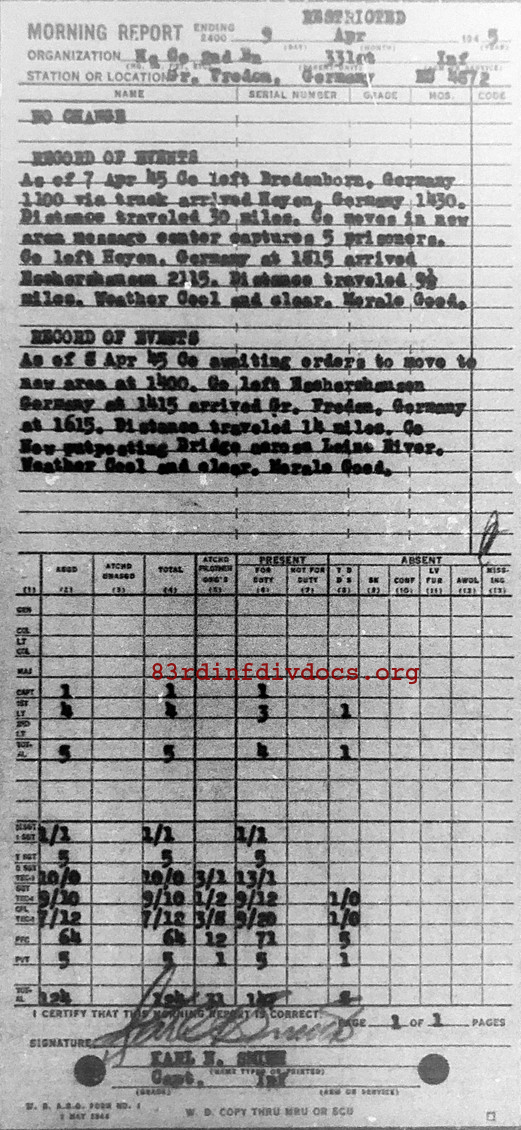 As of 7 Apr 45 Co left Bredenborn, Germany 1100 via truck arrived Heyen, Germany 1430. Distance traveled 30 miles. Co moves in new area message center captures 5 prisoners. Co left Heyen, Germany at 1815 arrived Eschershausen 2115. Distance traveled 5 1/2 miles. Weather Cool and clear. Morale Good.