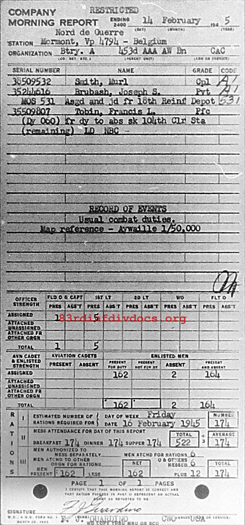 Morning report A/453AAA for February 14, 1945