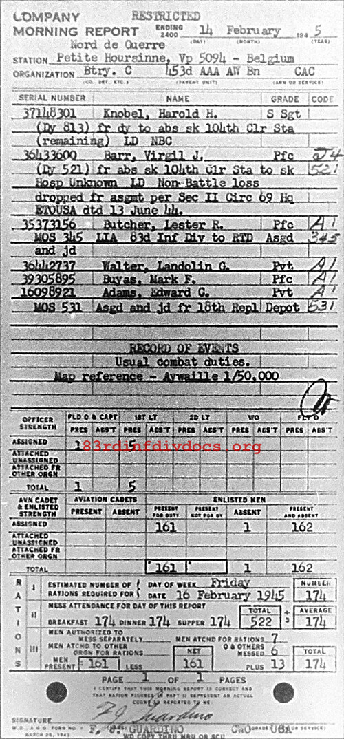Morning report C/453AAA for February 14, 1945