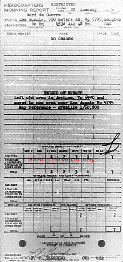 Morning report HQ/453AAA for January 22, 1945
