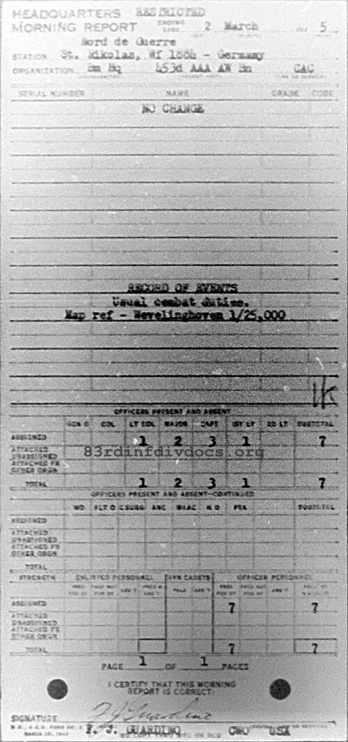 Morning report HQ/453AAA for March 2, 1945