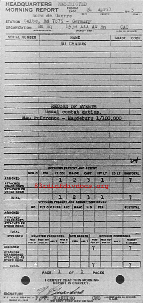 Morning report HQ/453AAA for April 24, 1945