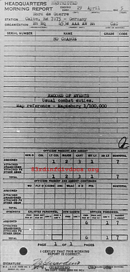 Morning report HQ/453AAA for April 29, 1945