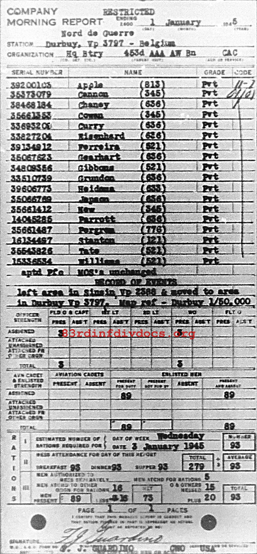 Morning report HQBTRY/453AAA for January 1, 1945
