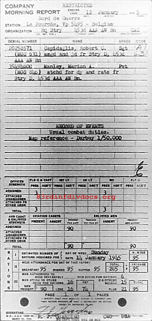 Morning report HQBTRY/453AAA for January 12, 1945