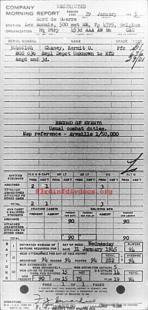 Morning report HQBTRY/453AAA for January 29, 1945