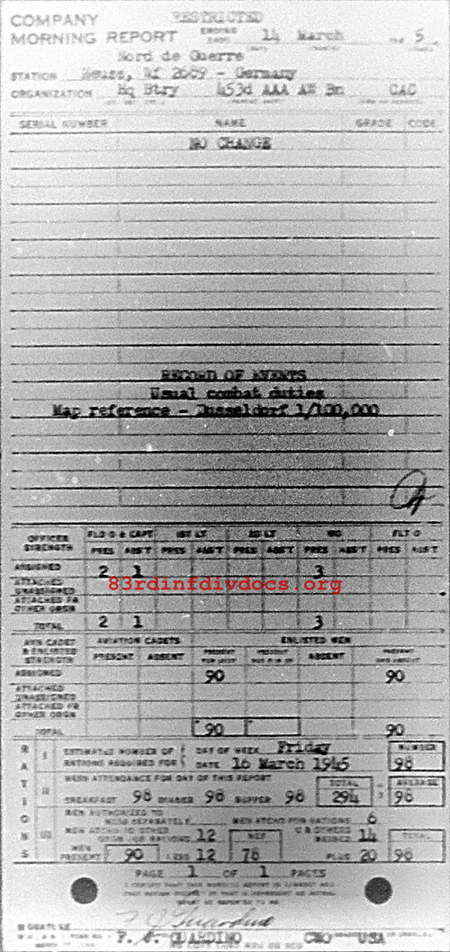 Morning report HQBTRY/453AAA for March 14, 1945