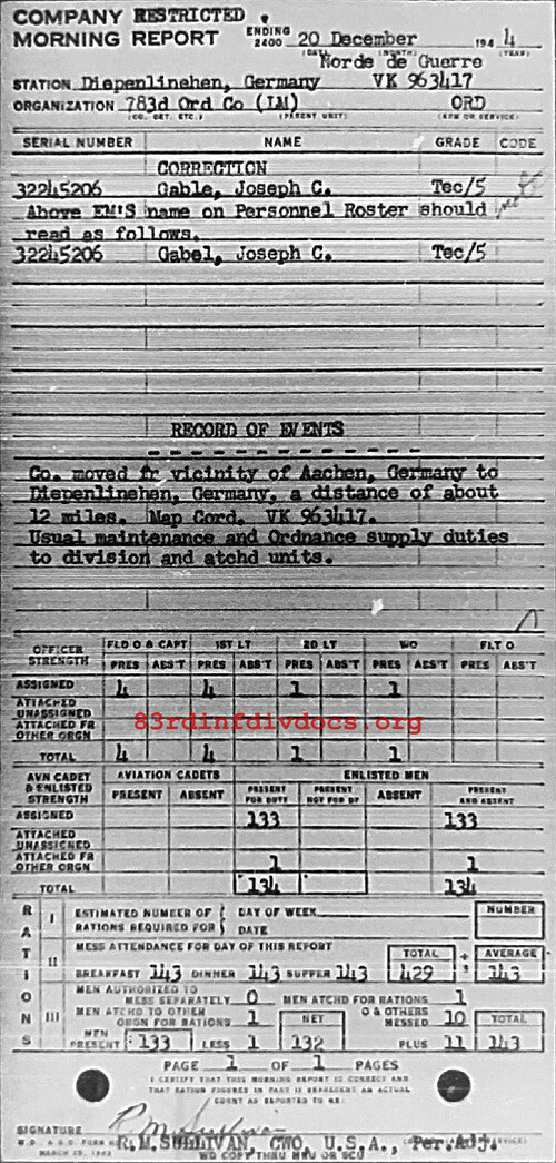 Co. moved fr vicinity of Aachen, Germany to Diepenlinchen, Germany, a distance of about 12 miles. Map Cord. vK963417. Usual maintenance and Ordnance supply duties to division and atchd units.