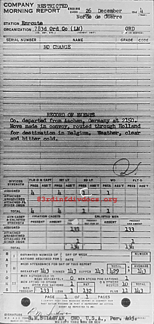 Co. departed from Aachen, Germany at 2150. Move made in convoy, routed through Holland, for destination in Belgium. Weather, clear and bitter cold.
