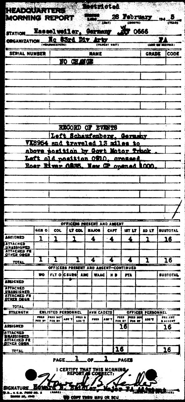 Left Schauffenberg, Germany vK8954 and traveled 13 miles to above position by Govt Motor Truck. Left old position 0910, crossed Roer River 0935, New CP opened 1000.