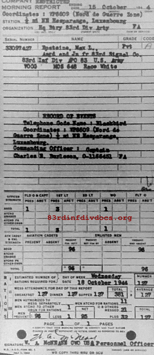 Morning report ARTYHQBTRY/83 for October 15, 1944