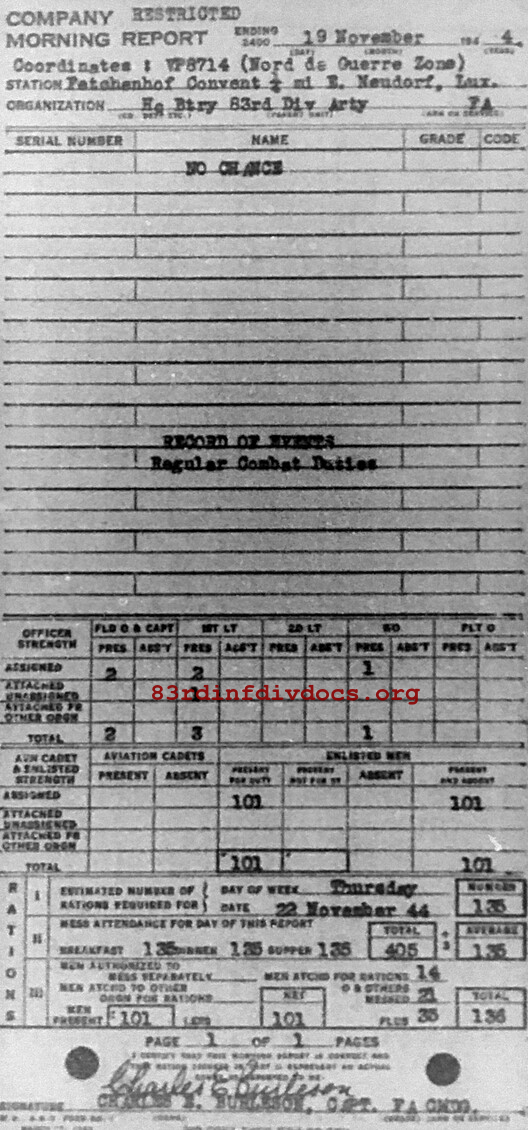 Morning report ARTYHQBTRY/83 for November 19, 1944