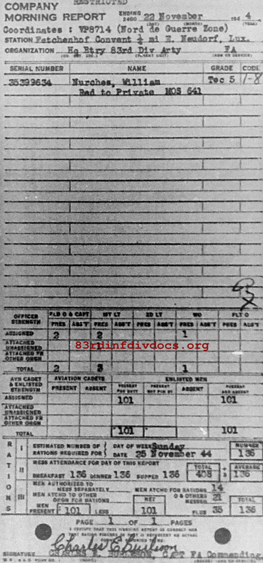 Morning report ARTYHQBTRY/83 for November 22, 1944