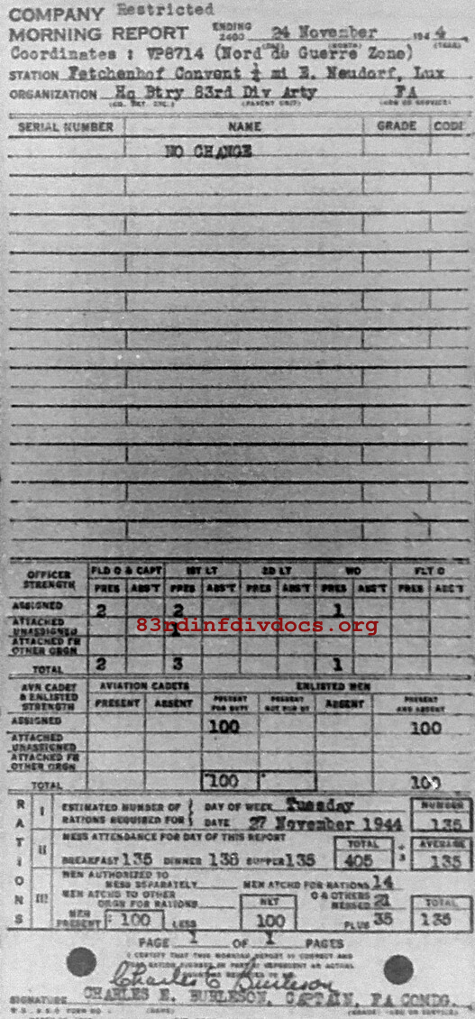Morning report ARTYHQBTRY/83 for November 24, 1944
