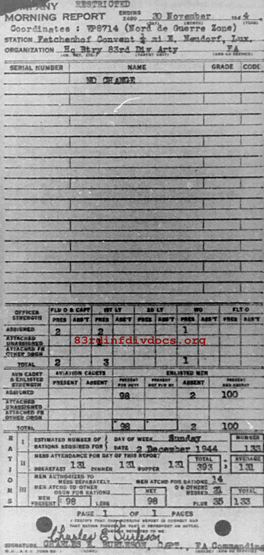 Morning report ARTYHQBTRY/83 for November 30, 1944