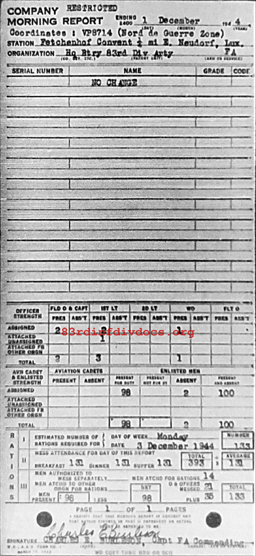Morning report ARTYHQBTRY/83 for December 1, 1944
