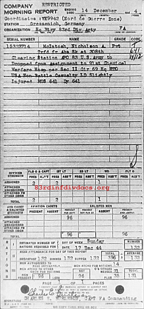 Morning report ARTYHQBTRY/83 for December 14, 1944