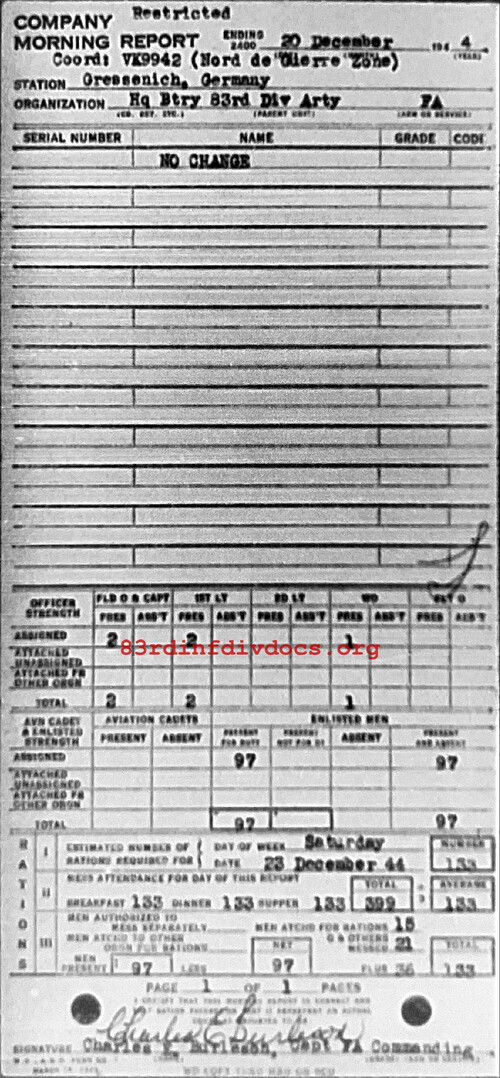 Morning report ARTYHQBTRY/83 for December 20, 1944