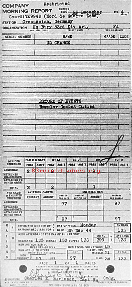 Morning report ARTYHQBTRY/83 for December 22, 1944