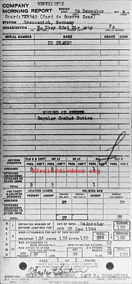 Morning report ARTYHQBTRY/83 for December 24, 1944