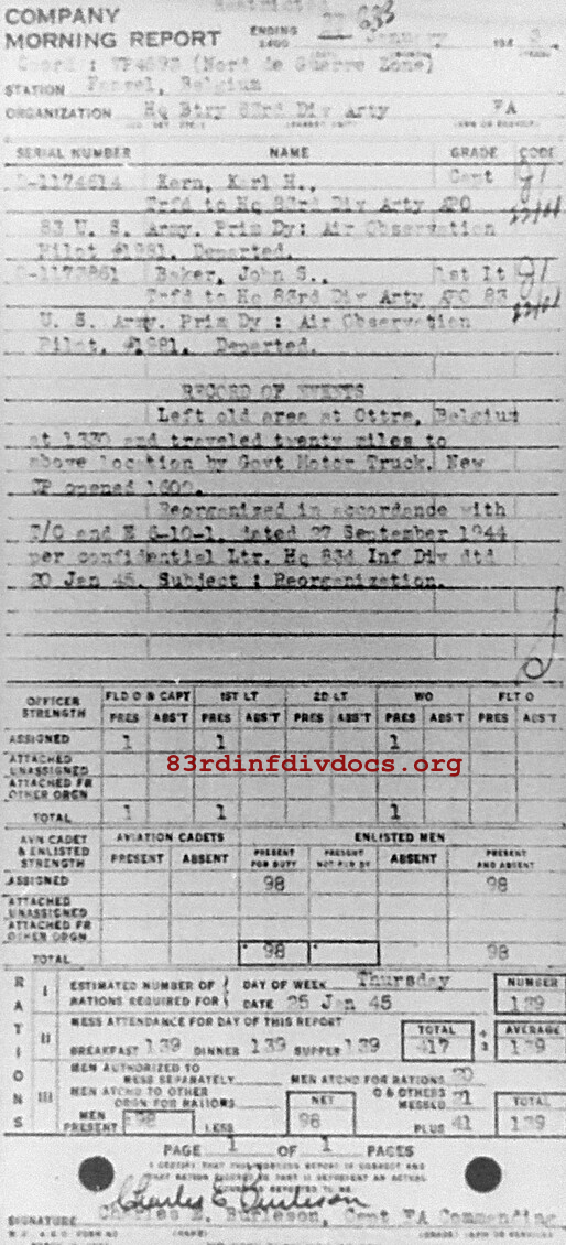 Left old area at Ottre, Belgium at 1330 and traveled twenty miles to above location by Govt Motor Truck. New CP opened 1600. Reorganized in accordance with T/O and E 6-10-1, dated 27 September 1944, per confidential Ltr. Hq 83r Inf Div dtd 20 Jan 24, Subject: Reorganization.
