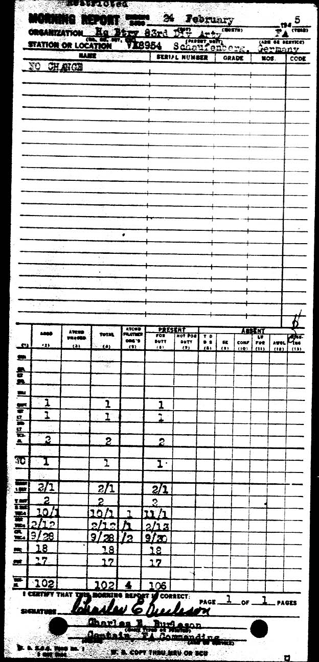 Morning report ARTYHQBTRY/83 for February 24, 1945