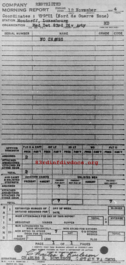 Morning report ARTYMEDDET/83 for November 12, 1944
