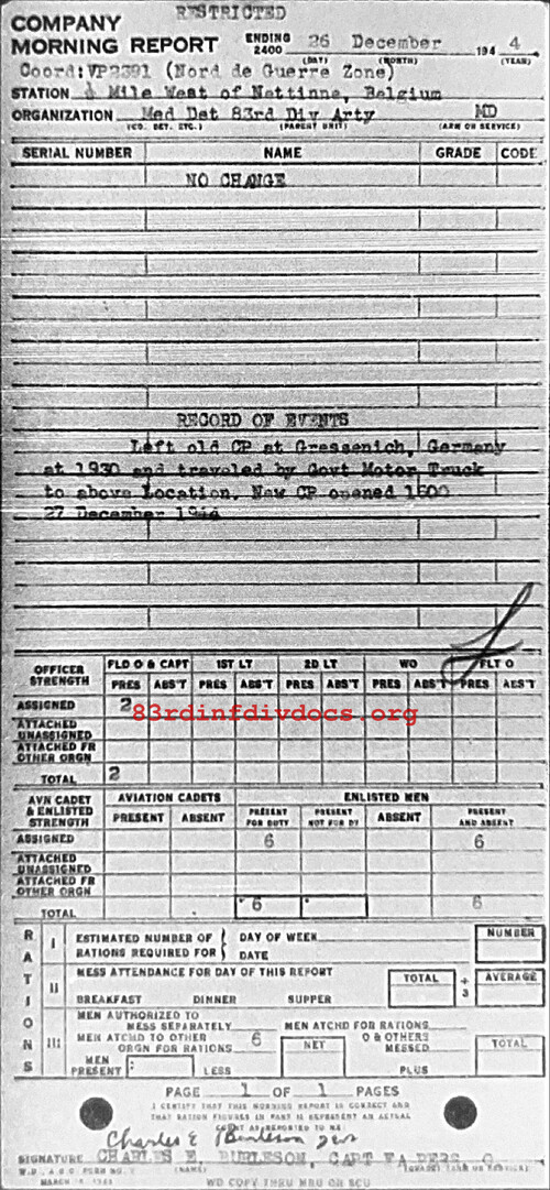 Morning report ARTYMEDDET/83 for December 26, 1944