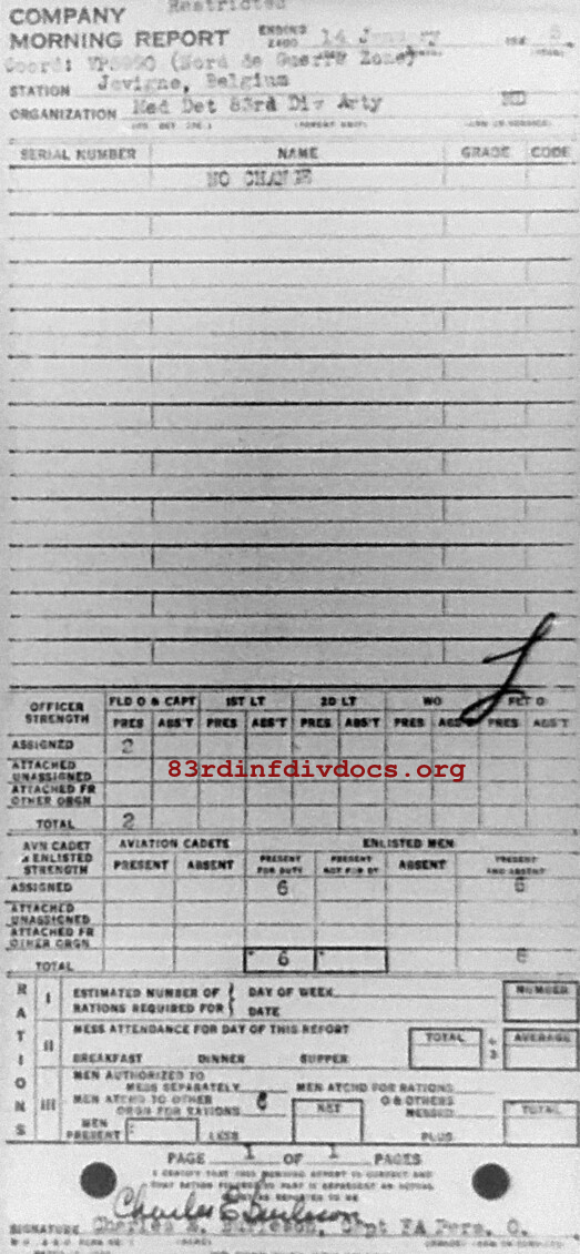 Morning report ARTYMEDDET/83 for January 14, 1945