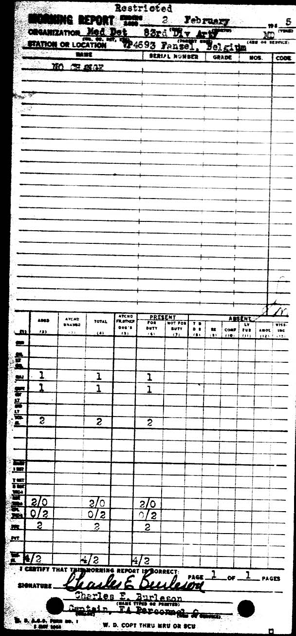 Morning report ARTYMEDDET/83 for February 2, 1945