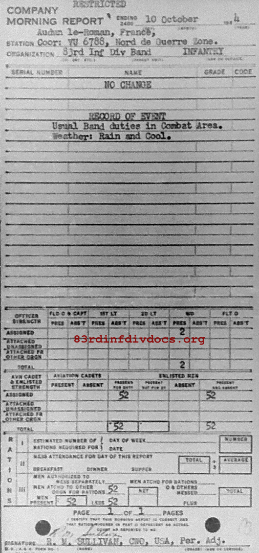 Usual Band Duties in Combat Area. Weather: Rain and Cool.