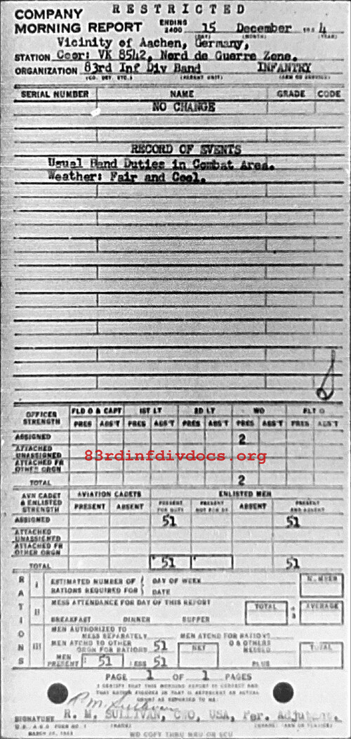 Usual Band Duties in Combat Area. Weather: Fair and Cool.