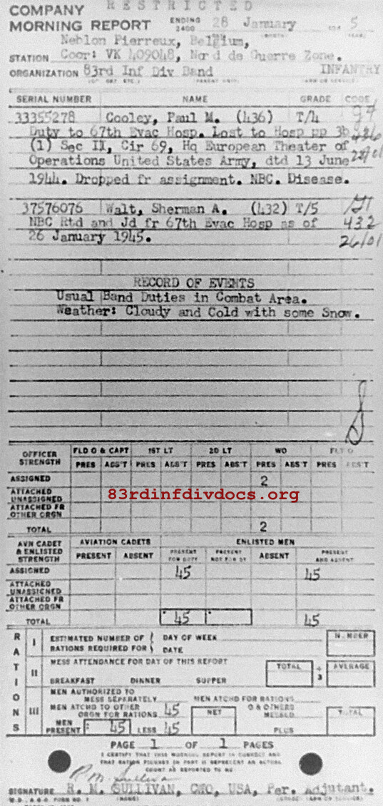 Usual Band Duties in Combat Area. Weather: Cloudy and Cold with some Snow.